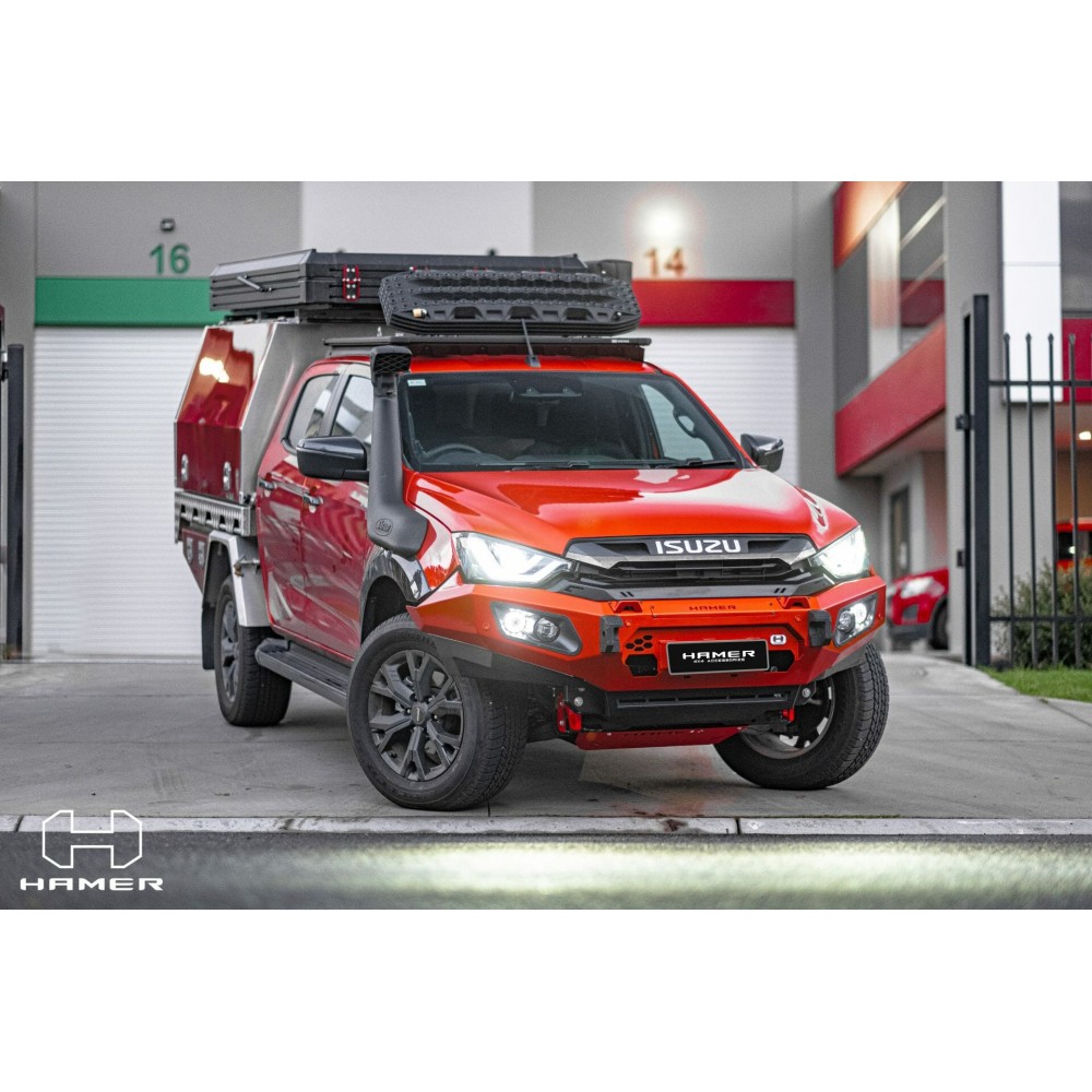 Constructed from robust 3 mm high-grade steel plate, the Hamer King Series Bull Bar is ADR and Airbag compliant, providing peace of mind without compromising safety. It accommodates original factory parking sensors and features a sleek, integrated design, complemented by a matte black powder-coated finish for an enduring appeal.
