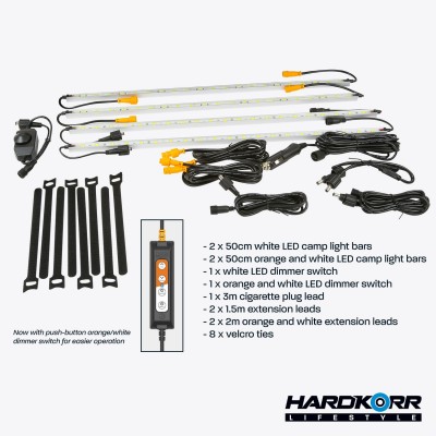 Our Hardkorr Lifestyle 4-bar LED camp light kit is perfect for occasional campers and budget travellers. Representing outstanding value for money, this kit has been manufactured to our meticulous standards and contains all the features you need for a great camping trip. Best of all, two of the included bars come with our famous orange/white light technology!