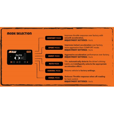 The TR+ Throttle Controller has six driving modes, each with nine customised settings that gives the driver the ability to finely tune their vehicle’s accelerator to suit their personal driving preferences.