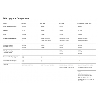 • A wheel and tyre package is required to support the increased GVM. The new max tyre size becomes 285/70R18. Rims and tyre MUST be load rated to be compliant with GVM upgrade. OEM Factory Rim DO NOT have a documented load rating therefore cannot support the increased GVM. Minimum tyre and rim rating 1275kg.